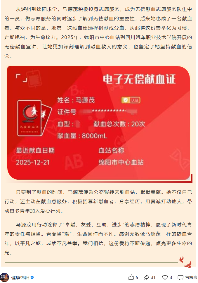 从校园走向市级平台:我院学生马源茂事迹获 “健康绵阳” 官微专题报道